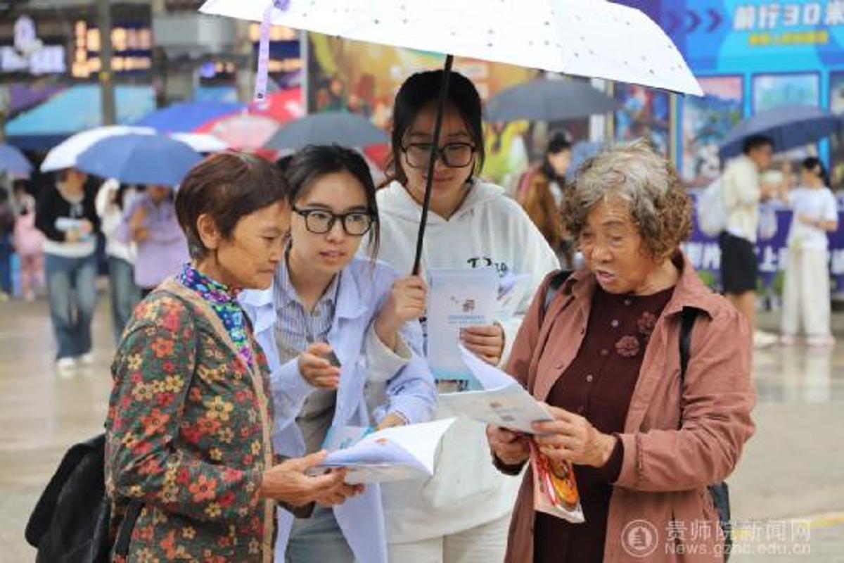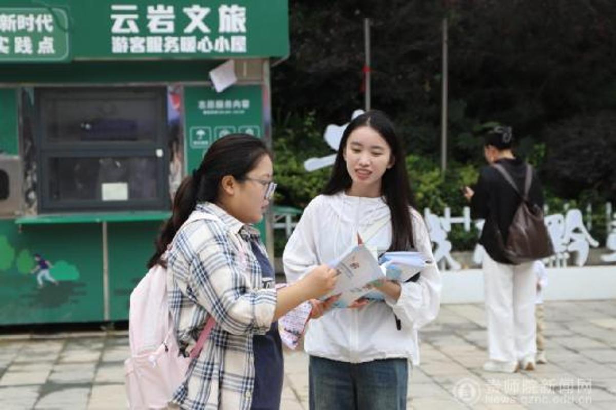 图为贵州师范学院旅游文化学院志愿者运用专业知识,为游客生动讲解《旅游安全实务手册》要点