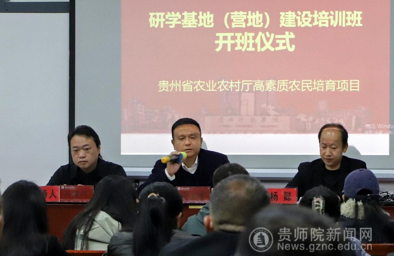 11月10日,由贵州省农业农村厅主办、贵州师范学院旅游文化学院承办的“2025年贵州省高素质农民培育项目乡村研学基地(营地)建设培训班”在榕江县正式开班。本次开班仪式由贵州师范学院旅游文化学院党委书记冯建国主持并致辞,榕江县融媒体中心副主任杨懿、贵州师范学院旅游文化学院院长李乐京及来自全省各地的研学基地负责人、农业从业者等50余人参加开班仪式。