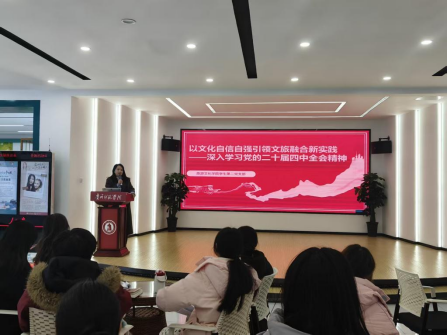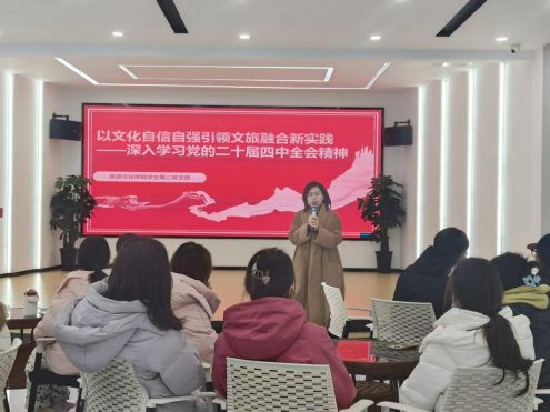 为深入学习贯彻党的二十届四中全会精神,推动文化自信自强理念与文旅专业实践深度融合,强化学生党员的使命担当,12月23日中午,旅游文化学院学生第二党支部在“一站式”学生社区服务大厅成功举办“以文化自信自强引领文旅融合新实践”主题党日活动暨学术座谈会。活动特邀姚莉院长讲授专题党课,党支部党员共同参与学习交流,在思想碰撞中凝聚文旅融合发展的奋进力量。